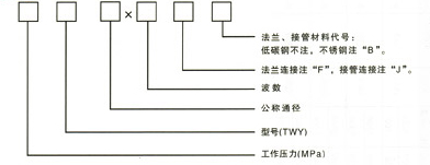 表示:公稱通徑為500mm,工作壓力為0.6MPa(6kg/cm2)波數為8個,不銹鋼管連接的軸向型外壓式波紋補償器。
