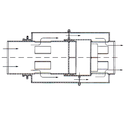 結構特點是:外套管串聯(lián)兩個填料密封箱,內套管后端加擋板,流體經(jīng)內套管的孔道引到兩密封箱間隔腔,再經(jīng)外套管間隔腔處孔道,引回到后部加擋板的主管道。這種補償器比平衡腔式補償器減少一個密封箱,結構簡單,但比平衡腔型補償器重量大,安裝尺寸長。