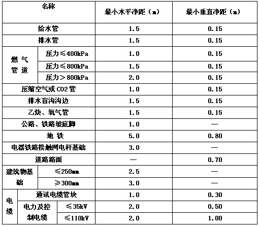 1.直埋供熱管道的布置應符合_現行標準的有關規定。管道與有關設施的相互水平或垂直凈距應符合下表的規定。