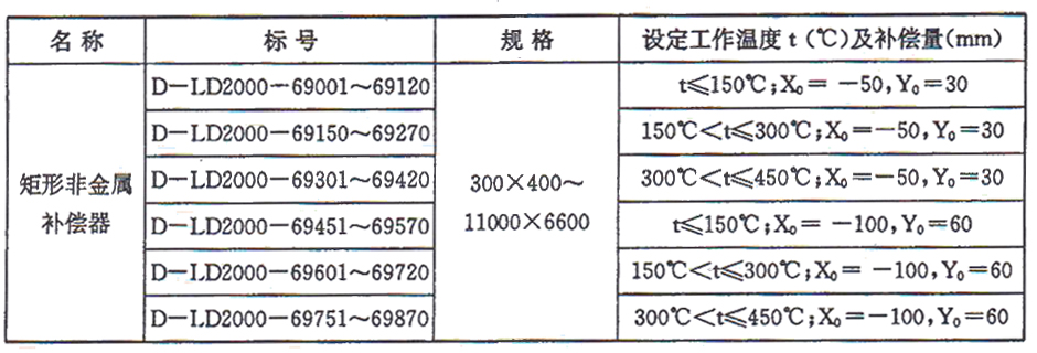 0為拉伸變形、系列外規格的矩形非金屬補償器以及工作溫度為800℃~1100℃的高溫矩形非金屬補償器,可向制造廠另行訂貨。